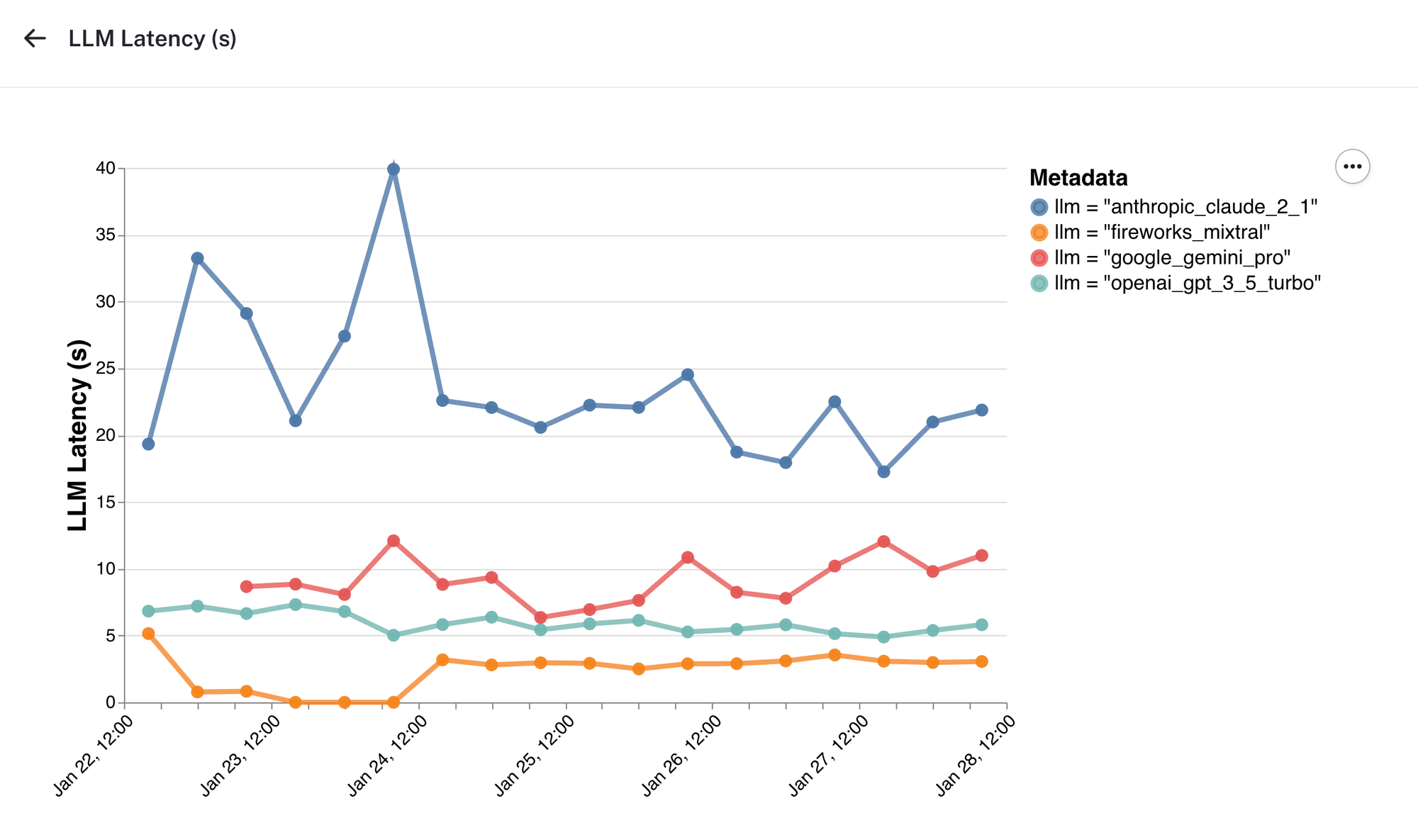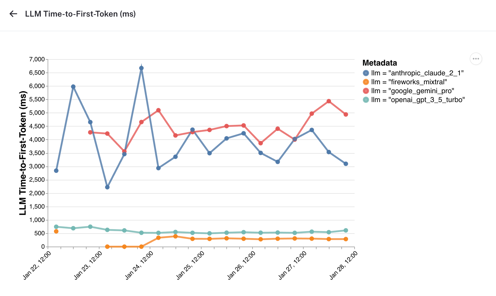 Let’s say we’re interested in analyzing how each model is performing w.r.t important metrics, such as latency and time-to-first-token.