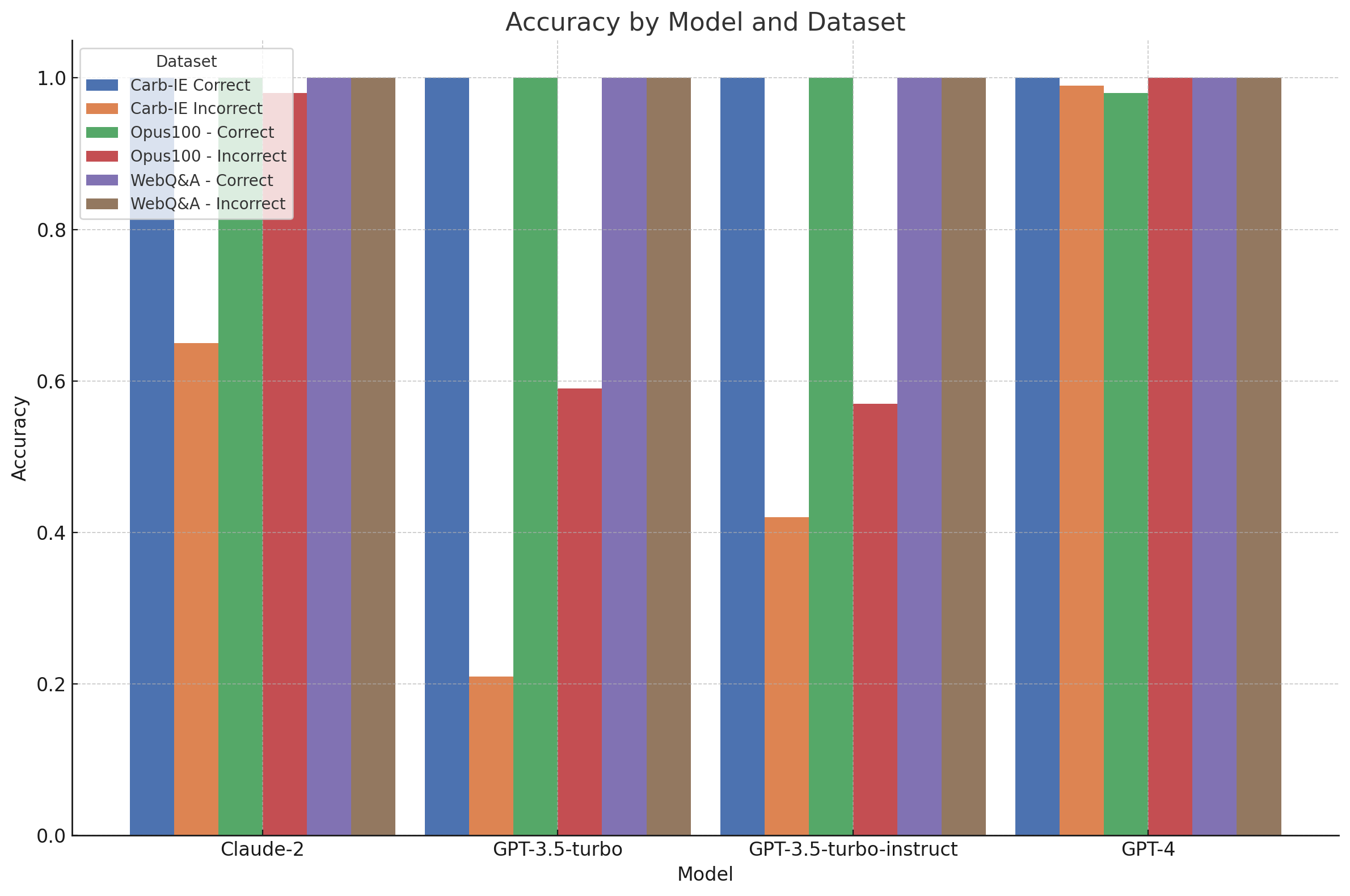 The results indicate GPT-4 indeed outperforms the others in structured "reasoning" tasks, such as when evaluating on the Carb-IE extraction dataset. On the other hand, Claude-2 and GPT-3.5 show reliability in simpler tasks like translation and Web Q&A but falter when additional reasoning is needed. Notably, the results table above shows that GPT-3.5-turbo struggled with false positives and had high null rates, meaning it often provided unusable responses.