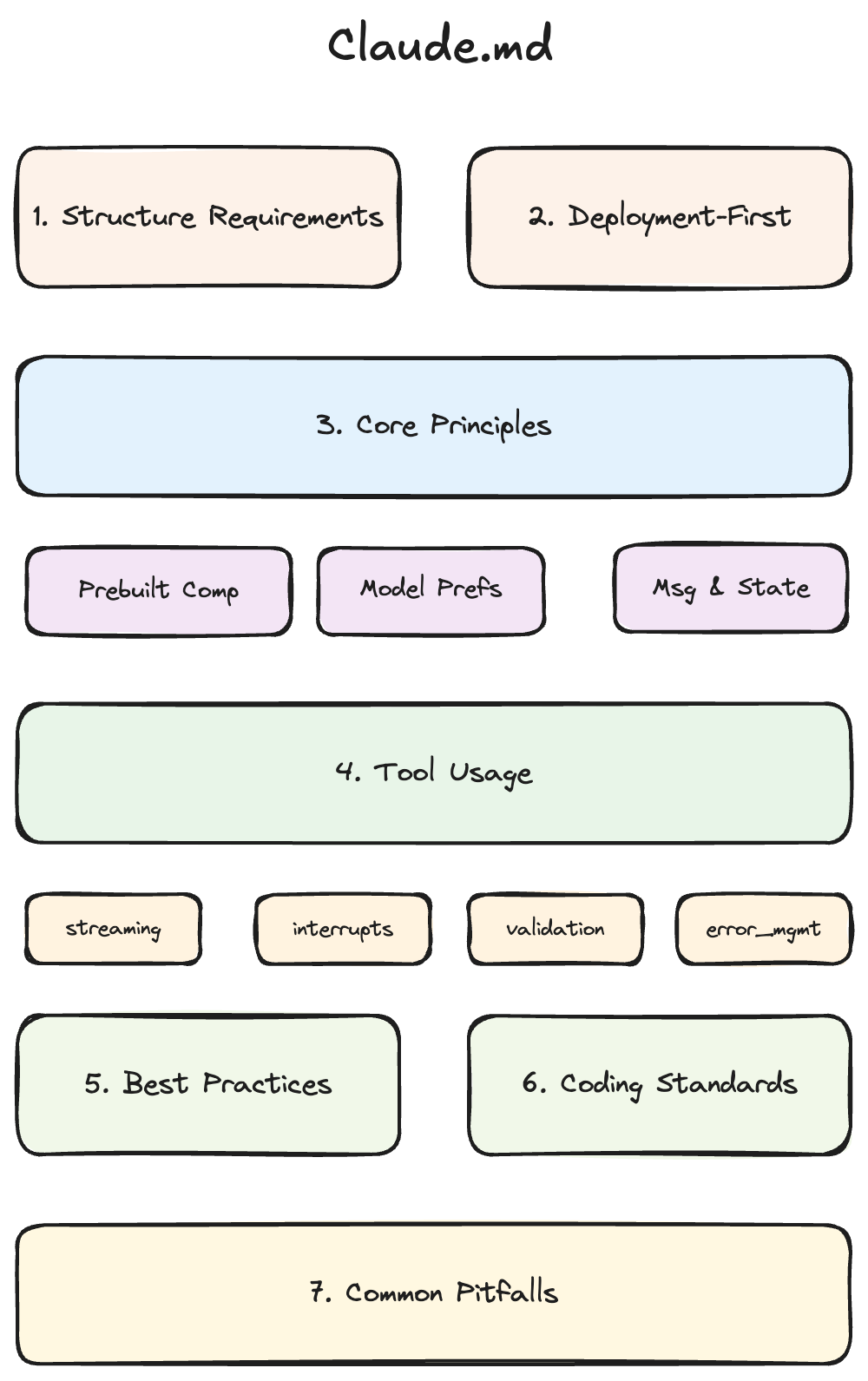 We also included LangGraph-specific coding standards like structured output validation, proper message handling, and other framework integration debugging patterns. Since Claude has access to web tools, we added specific documentation URLs at the end of each section for further reference and navigation guidelines.