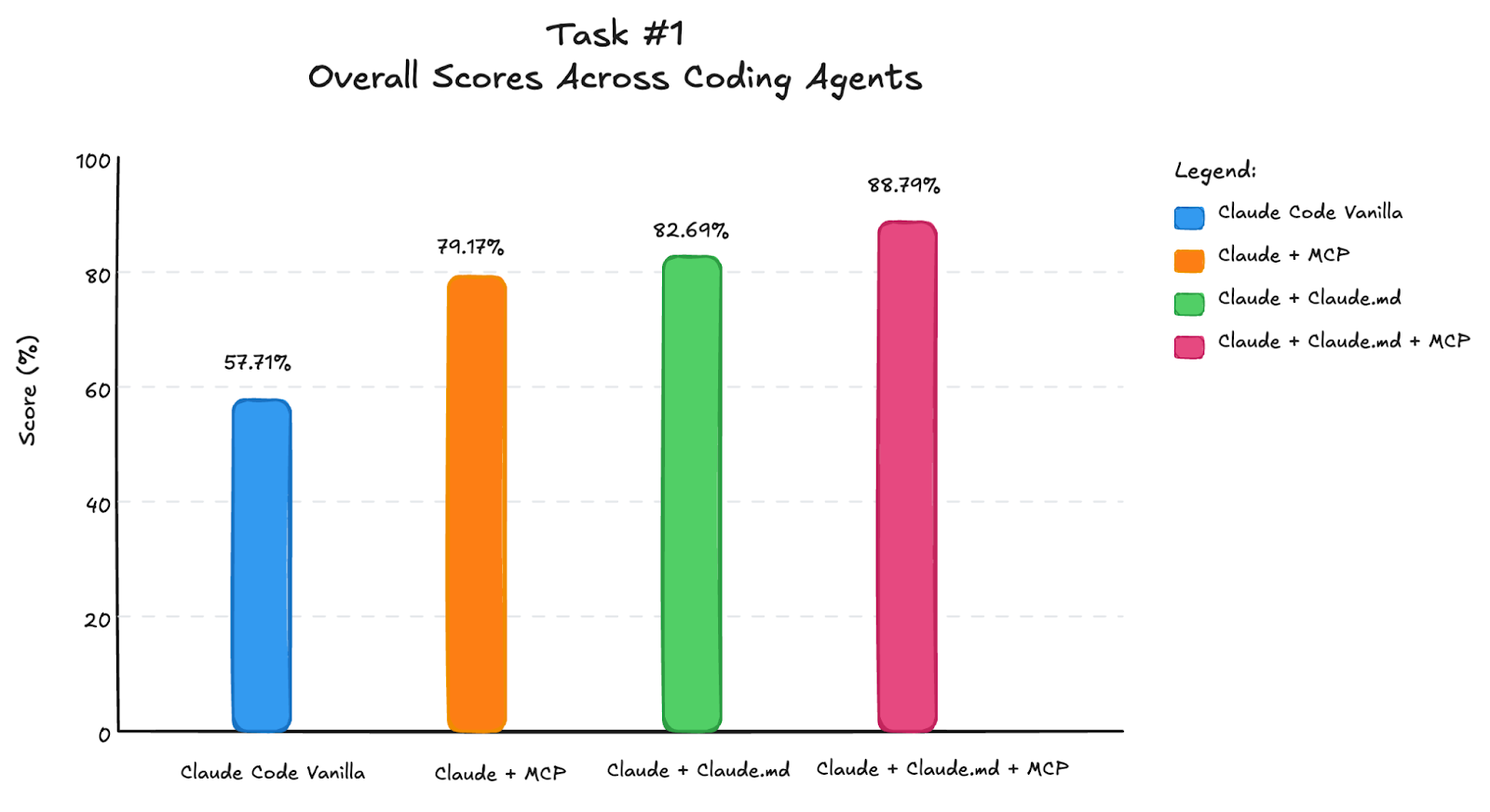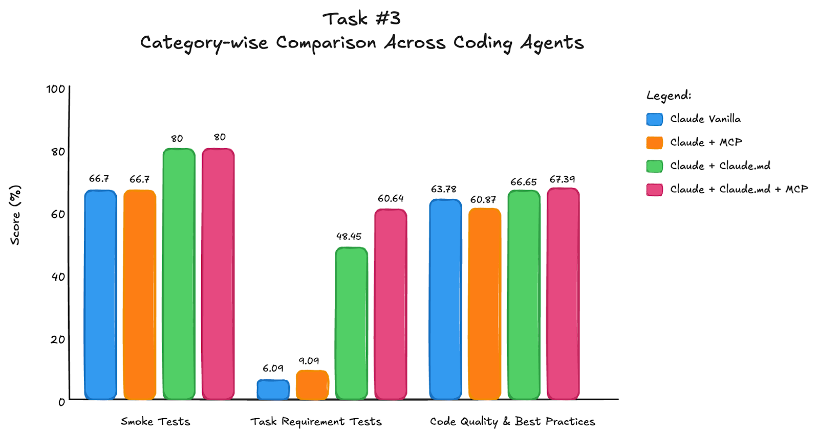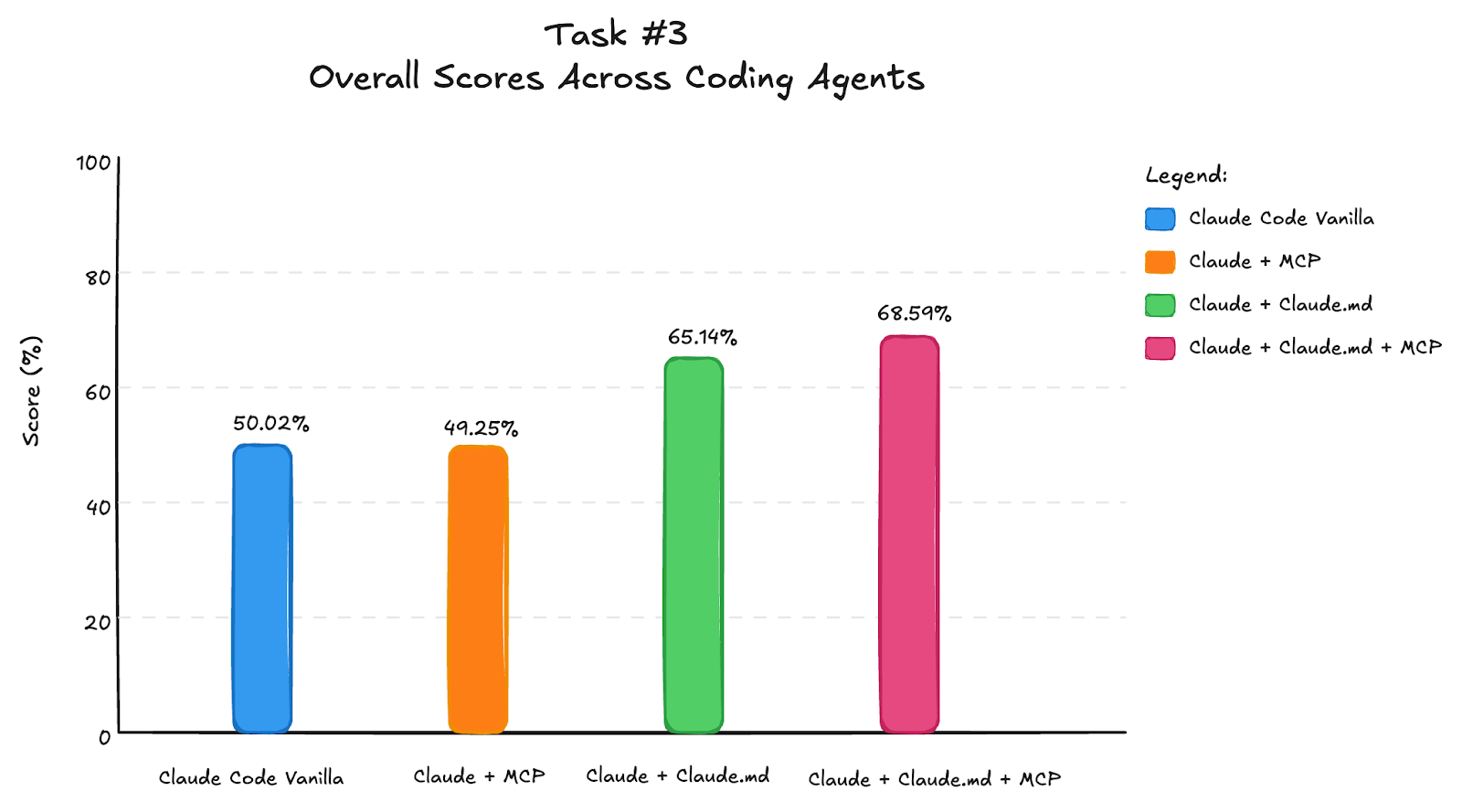 We average scores across three different LangGraph tasks to compare Claude Code configurations. The chart below shows overall scores: