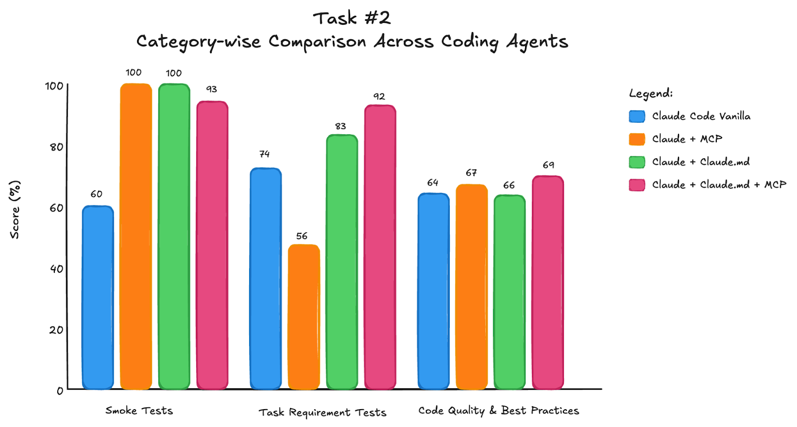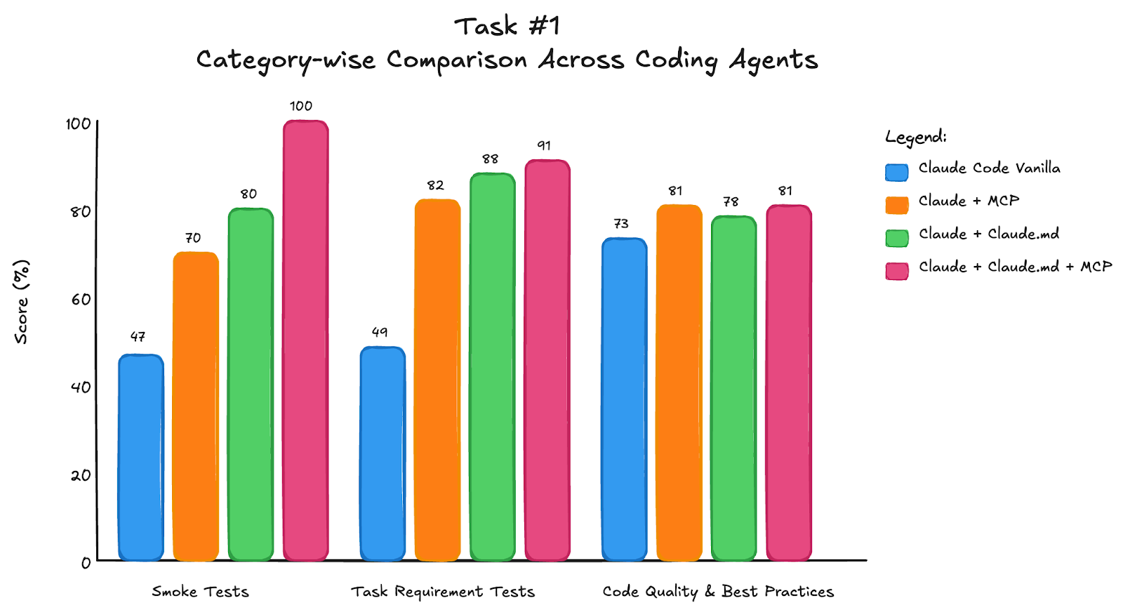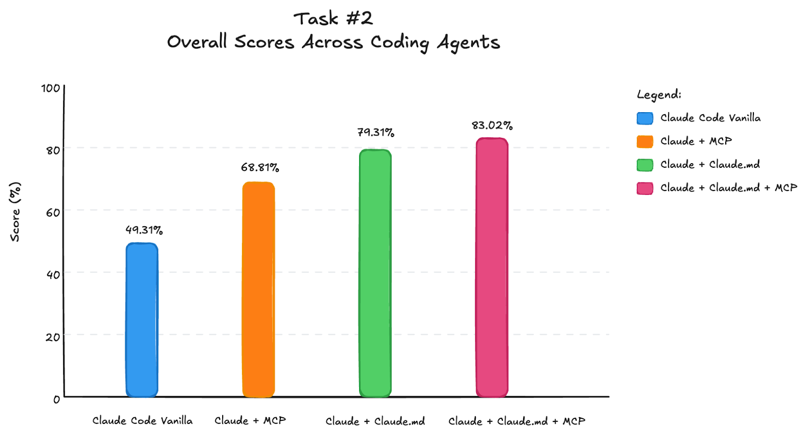 This doesn’t mean MCP tools didn’t help on their own. They improved scores by ~10 percentage points, mainly by grounding the agent in basic syntax and concepts. But for task completion and code quality, Claude.md was more important. The guide included pitfalls to avoid and principles to follow, which helped Claude Code think better and explore different parts of the library rather than stopping at high-level descriptions.