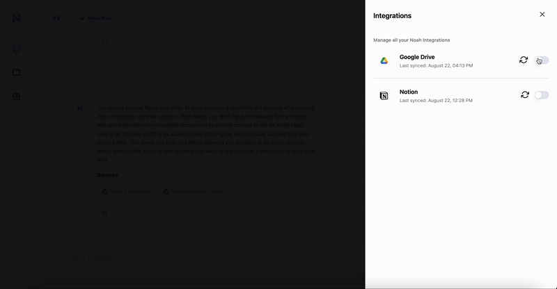Simplicity and user-friendliness are core to Noah. We take care of all the heavy-lifting in the background. In just a few clicks, users can sync hundreds of files from their own Google Drive and Notion and start getting help from Noah.
