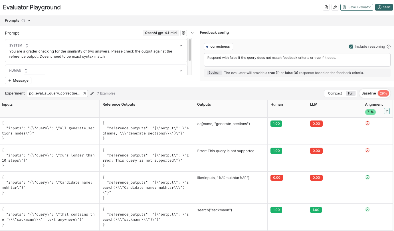 - A playground-like interface to iterate on your evaluator prompt and see the evaluator’s “alignment score”