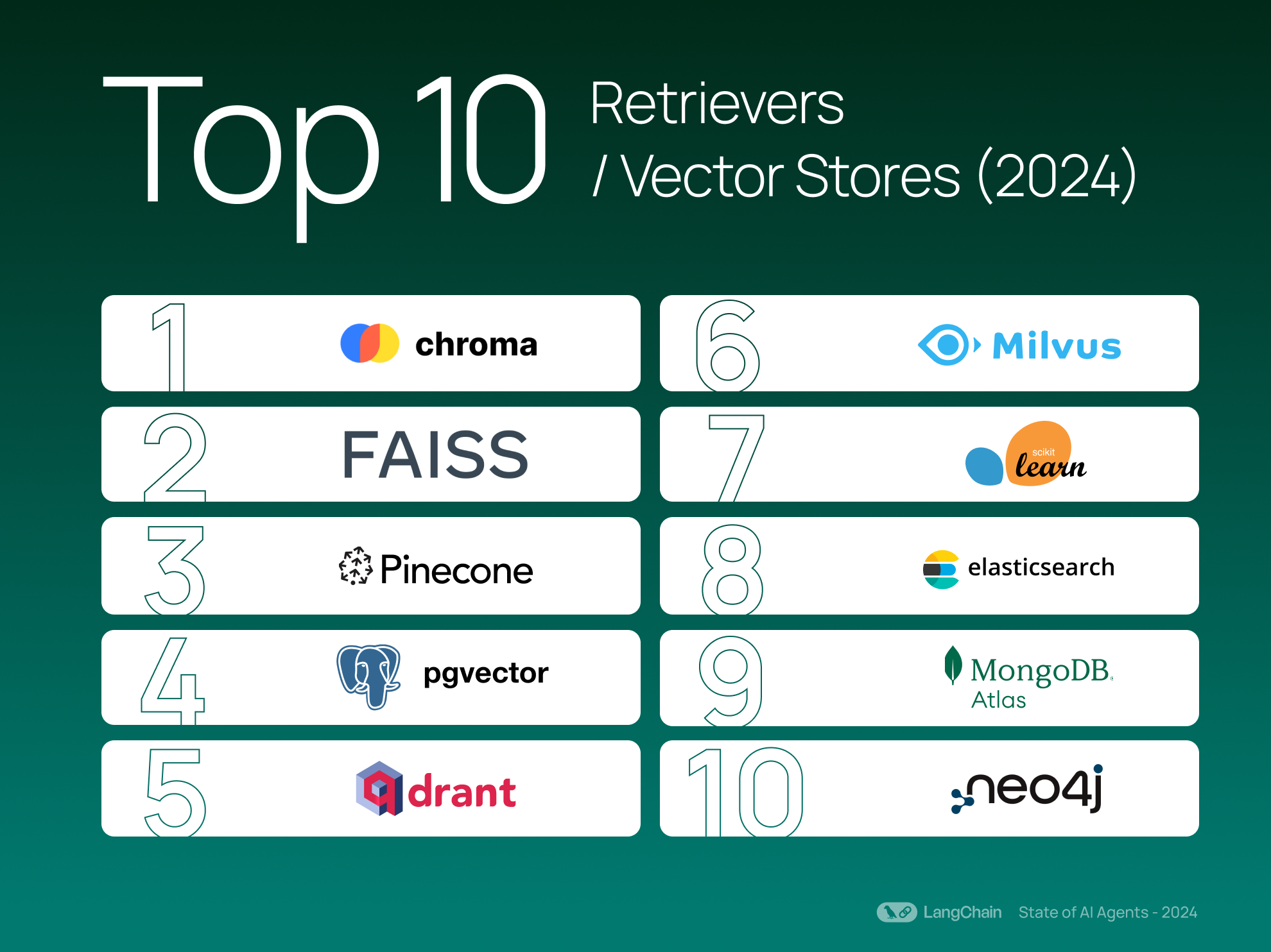 Performing retrieval is still critical for many GenAI workflows. The top 3 vector stores have remained the same as last year, with Chroma and FAISS as the most popular choices. This year, Milvus, MongoDB, and Elastic’s vector databases have also entered the top 10.