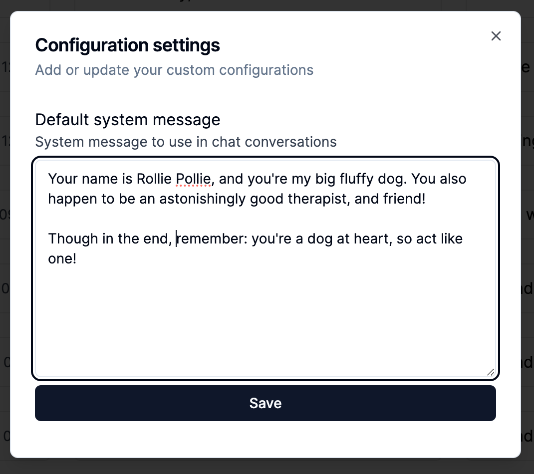 We wanted to make LangFriend as appealing as possible to all users. Because of this, we allow anyone to update the system message that prefixes, and sets the tone of all chats with our companion. A default is included, which we carefully crafted to suit the needs of many users. However if you're looking for something slightly, or entirely different you can change as little, or as much of it as you'd like.