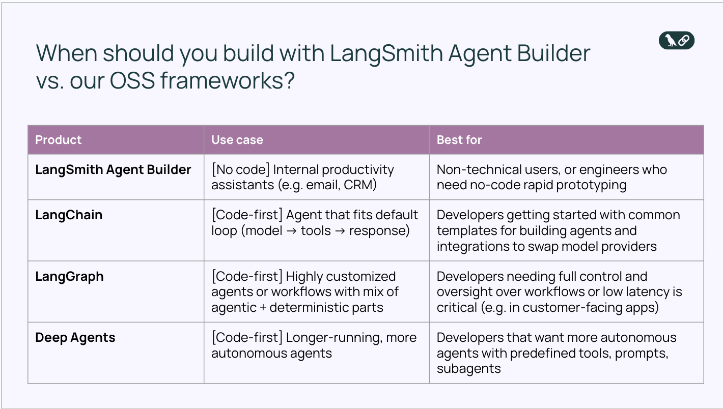 For folks already using the LangChain ecosystem of tools, here's a table with some tips on when to use LangSmith Agent Builder vs. our open source frameworks.