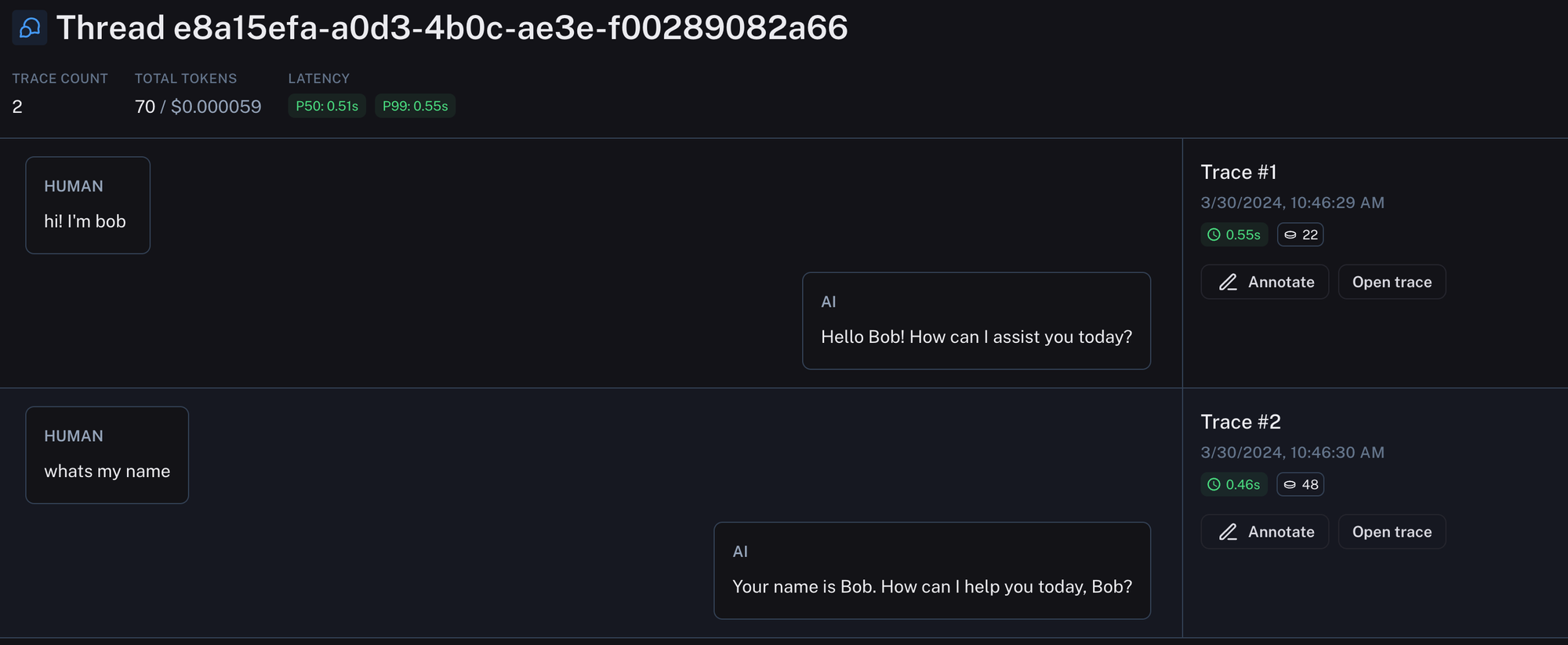 The dominant UX for LLM applications is still chat. In chat applications, there is a back and forth between human messages and an AI response. Each AI response is a trace (and can consist of many sub-runs). With Threads, we've now introduced a way to view the whole back-and-forth of a conversation in a single view. This can be done by attaching a special metadata key to each trace with the unique identifier for that conversation. This makes it much easier to debug conversations as you can see the whole thread in one place.