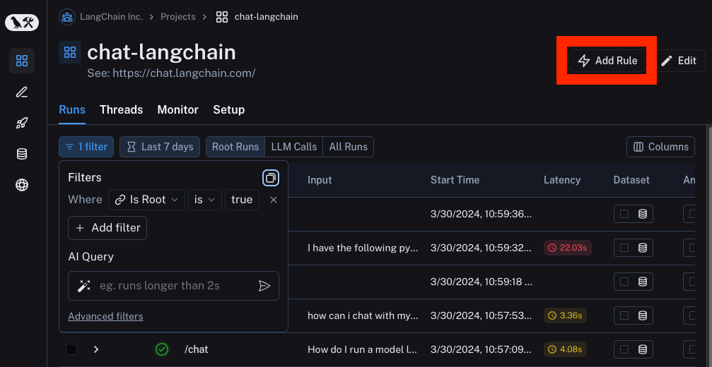 In order to make it as easy as possible to address these questions, we're releasing a new set of features around production logging and automations. Production monitoring allows you to more easily manually explore and identify your data, while automations allow you to start acting on this data in an automated way. Like all LangSmith features, these work whether you are using LangChain or not. In the rest of this blog, we will walk through what these features are. You can also check out our YouTube Playlist for video walkthroughs.