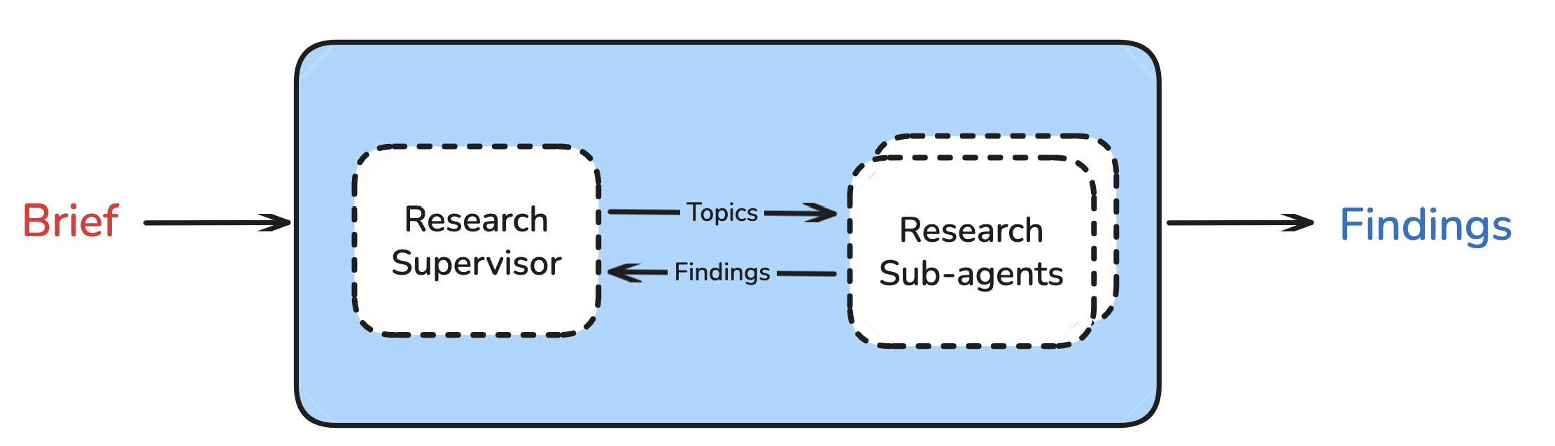 The supervisor reasons about whether the findings from the sub-agents sufficiently address the scope of work in the brief. If the supervisor wants more depth, it can spawn further sub-agents to conduct more research. As the supervisor delegates research and reflects on results, it can flexibly identify what is missing and address these gaps with follow-up research.
