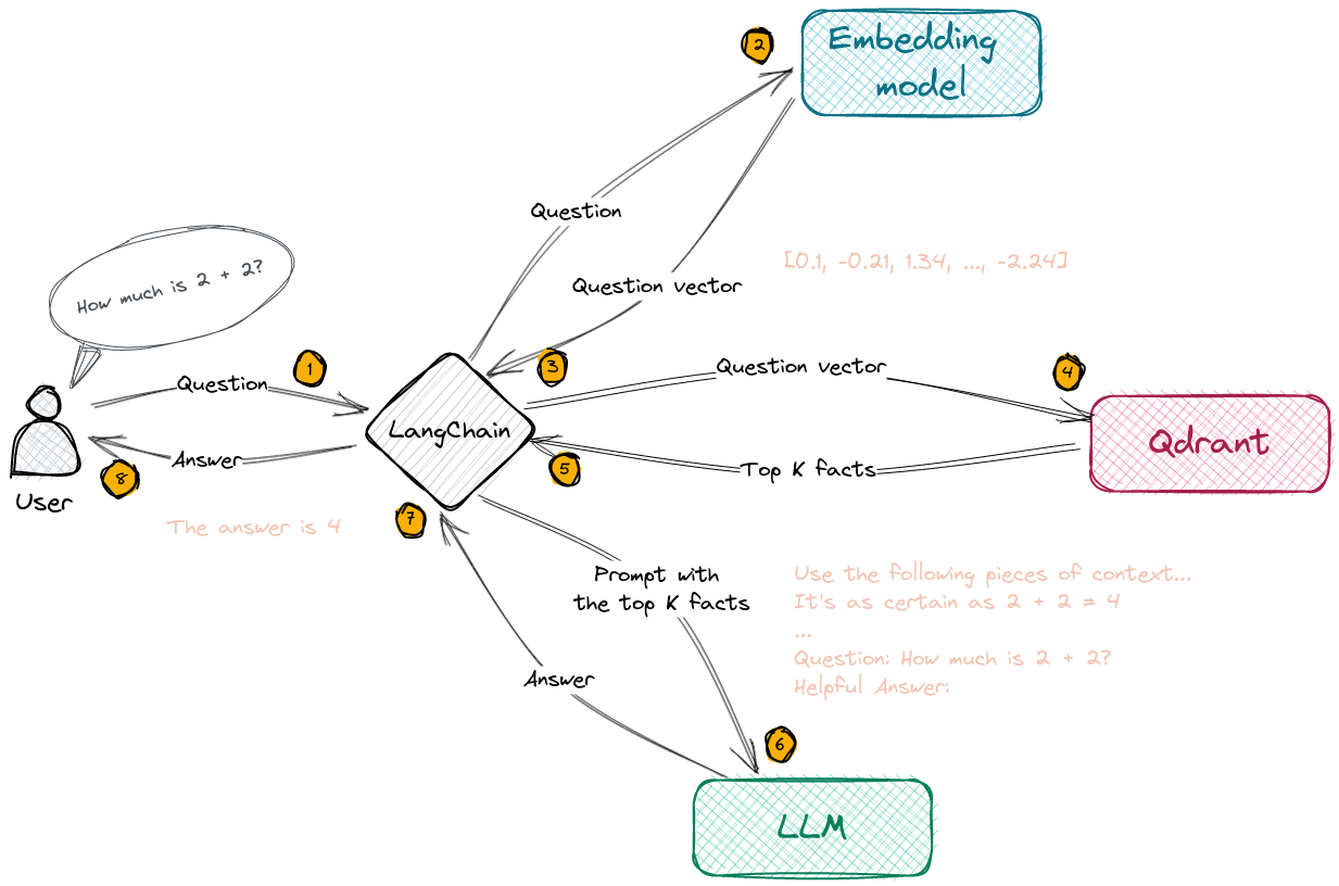 At its core, Qdrant vector database excels at semantic search. When supported by LangChain, Qdrant can help you set up effective QA systems, detection systems and chatbots that leverage Retrieval Augmented Generation (RAG) to its full potential. Qdrant streamlines the process of retrieval augmentation, making it faster, easier to scale and efficient. Adding relevant context to LLMs can vastly improve user experience especially in most business cases, where LLMs haven’t accessed such data before. Vector search is better at sorting through relevant context, when the available data is vast, at times in hundreds or thousands of documents.