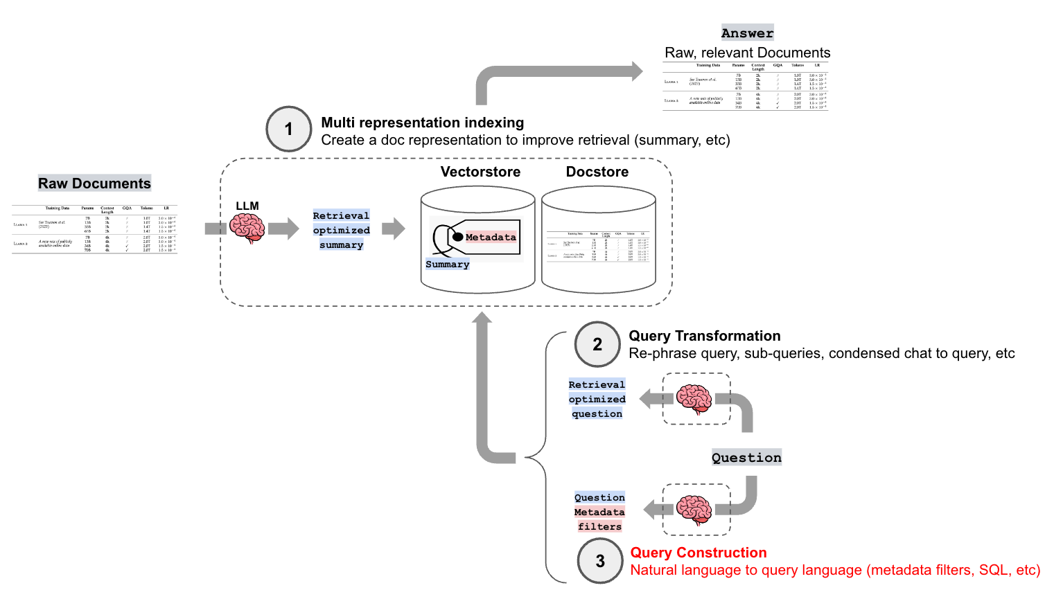 To address these challenges, LLMs have great capacity for query construction, the process of converting natural language into a specific query syntax for each data type. For this third installment in our blog series on advanced retrieval, we'll be covering various strategies for query construction (see our blog posts on Multi-Representation Indexing and Query Transformation for more.)