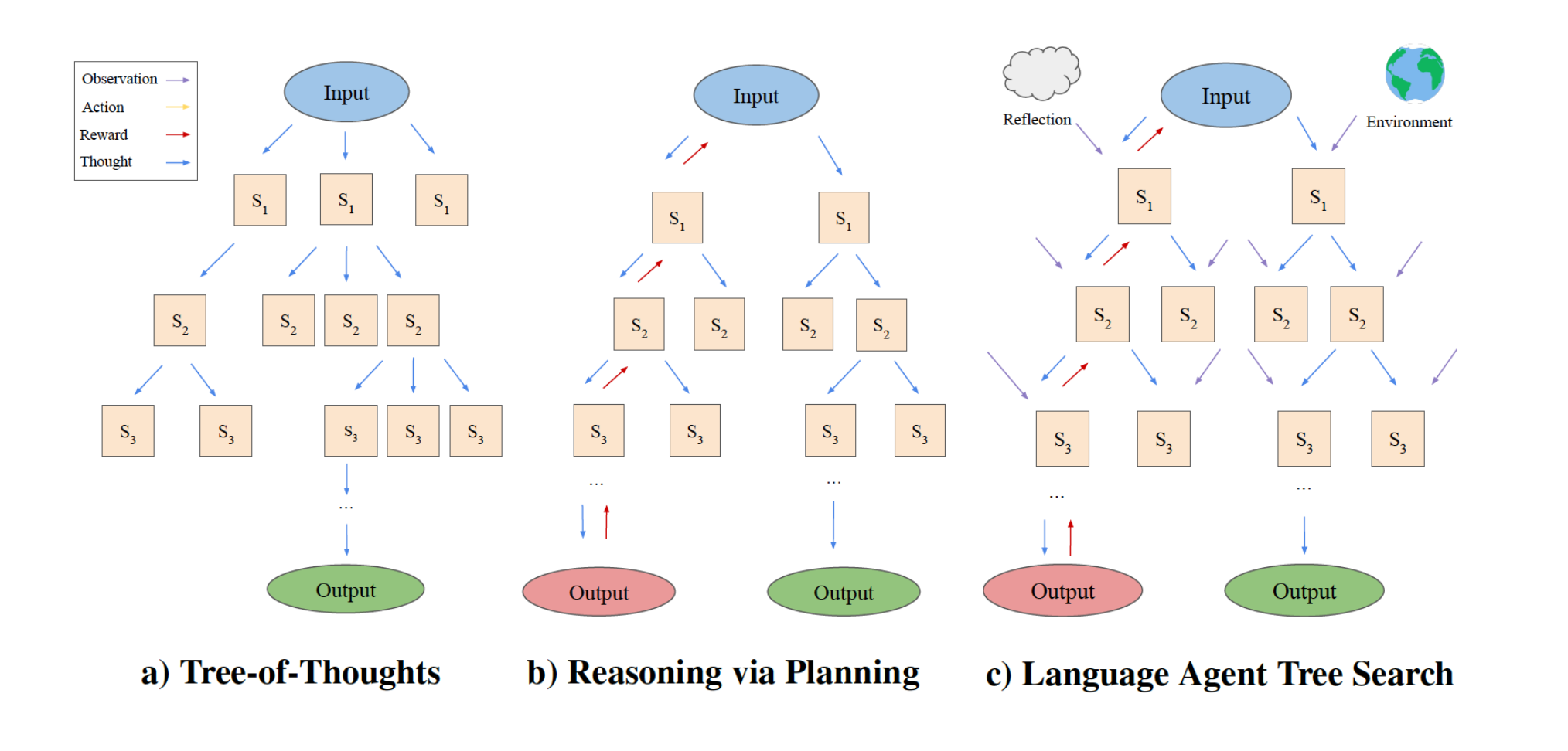 Language Agent Tree Search (LATS), by Zhou, et. al, is a general LLM agent search algorithm that combines reflection/evaluation and search (specifically Monte-Carlo trees search) to achieve better overall task performance compared to similar techniques like ReACT, Reflexion, or even Tree of Thoughts. It adopts a standard reinforcement learning (RL) task framing, replacing the RL agents, value functions, and optimizer all with calls to an LLM. This is meant to help the agent adapt and problem solve for complex tasks, avoiding getting stuck in repetitive loops.
