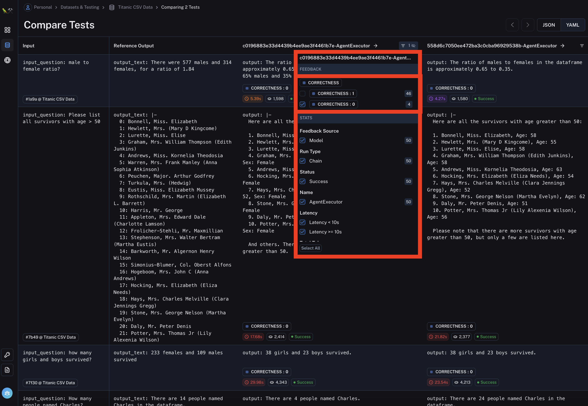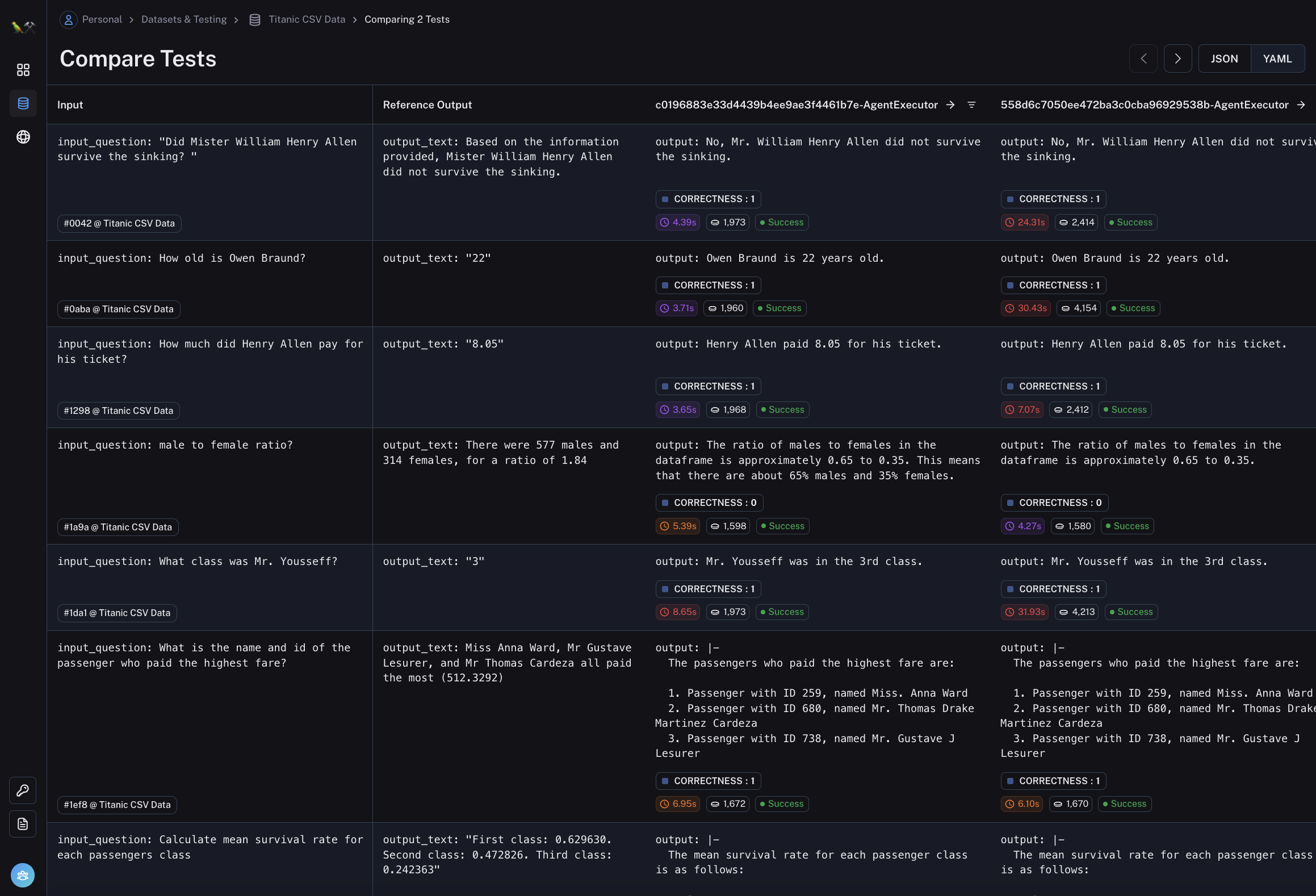 You can easily see the inputs, the reference output, and then the actual output for each datapoint - along with any eval metrics, time and latency for that run.