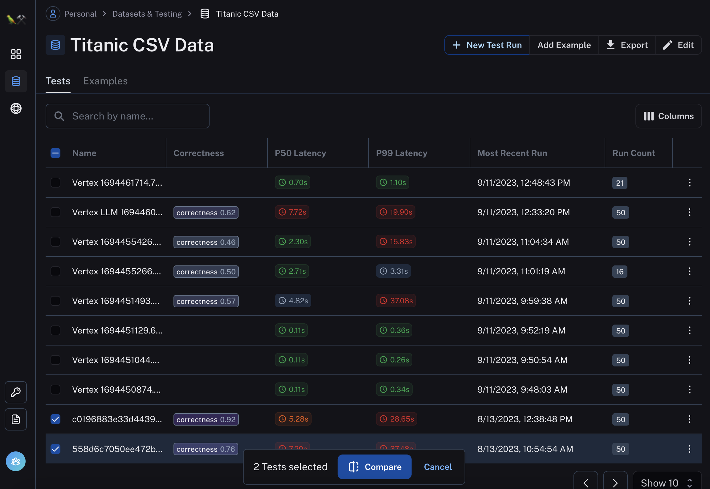 Inside a dataset, you can easily select two (or more) test runs, then click Compare.