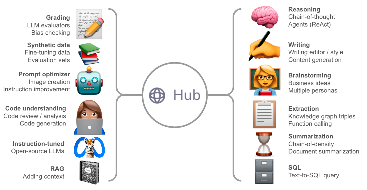 Prompt Engineering can steer LLM behavior without updating the model weights. A variety of prompts for different uses-cases have emerged (e.g., see @dair_ai’s prompt engineering guide and this excellent review from Lilian Weng). As the number of LLMs and different use-cases expand, there is increasing need for prompt management to support discoverability, sharing, workshopping, and debugging prompts. We launched the LangChain Hub over a month ago to support these needs, serving as a home for both browsing community prompts and managing your own. Below we provide an overview of the major themes in prompting that we’ve seen since launch and highlight interesting examples.