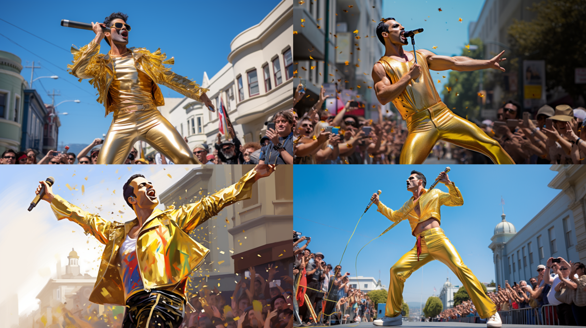 Freddie Mercury electrifying the San Francisco Pride Parade stage, shining in a gleaming golden outfit, iconic microphone stand in hand, evoking the hyper-realistic style of Caravaggio, vivid and dynamic --ar 16:9 --q 2)