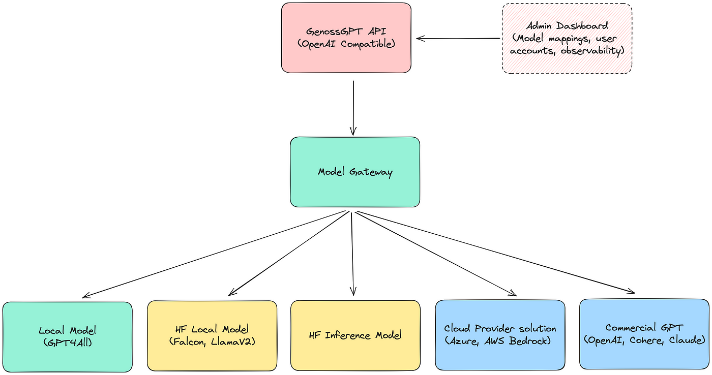 TL;DR: GenossGPT offers a universal interface for interacting with GPT models, simplifying the task of integrating and switching between models in your GenAI-powered application. It gives businesses control over their model usage, while leveraging LangSmith to provide enhanced observability and analytics in production.