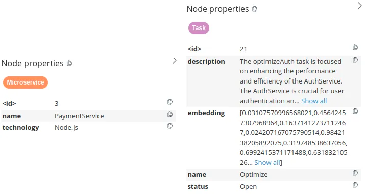 The microservice nodes have two node properties describing their name and technology. On the other hand, task nodes are more complex. They have the the name, status, description, as well as embedding properties. By storing text embedding values as node properties, you can perform a vector similarity search of task descriptions identical to if you had the tasks stored in a vector database. Therefore, knowledge graphs allow you to store and retrieve both structured and unstructured information to power your RAG applications.
