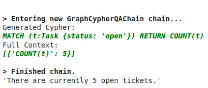 # [{'count(*)': 5}]There are five open tasks in our toy graph. While vector similarity search is excellent for sifting through relevant information in unstructured text, it lacks the capability to analyze and aggregate structured information. Using Neo4j, this problem can be easily solved by employing Cypher, which is a structured query language for graph databases.