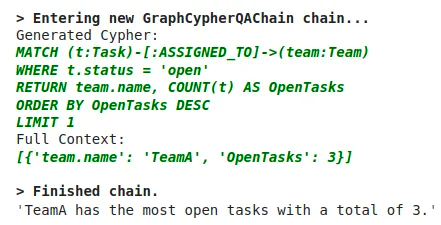 The neat thing about LangChain is that it provides a GraphCypherQAChain, which generates the Cypher queries for you, so you don’t have to learn Cypher syntax in order to retrieve information from a graph database like Neo4j.