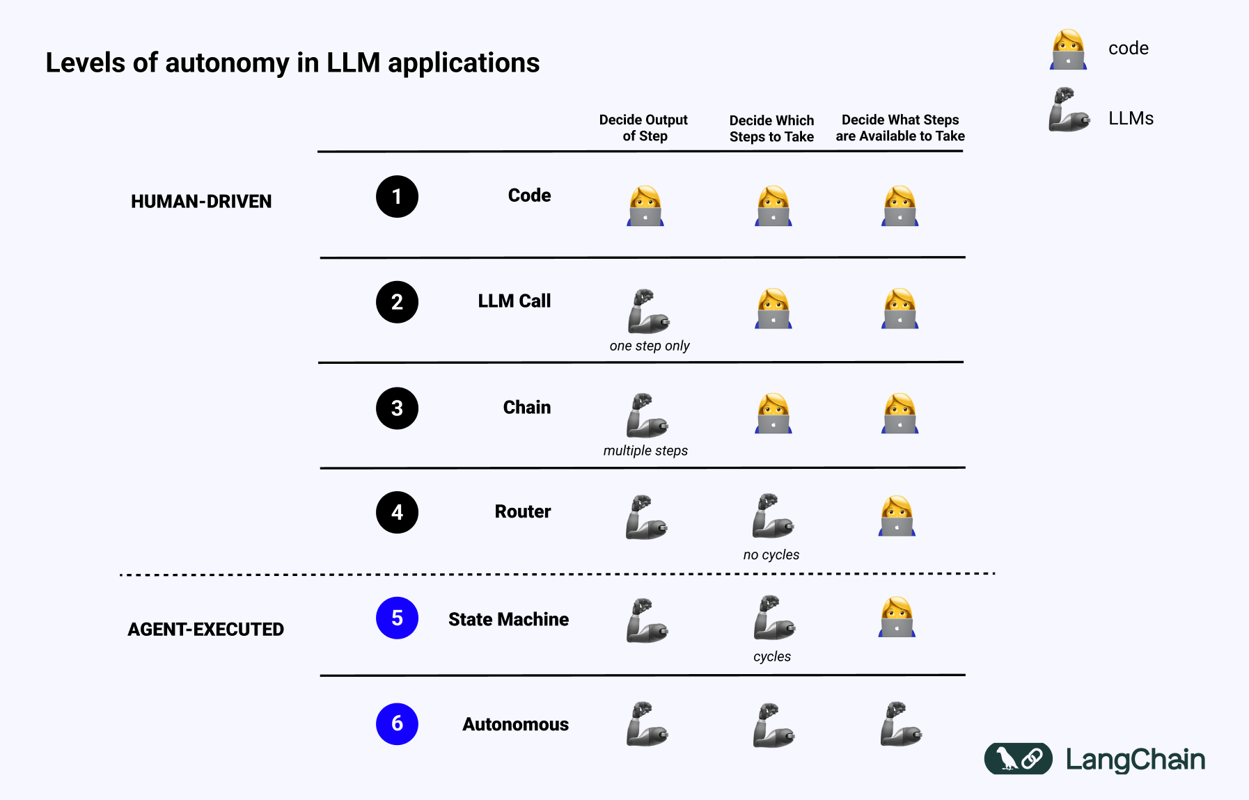 I gave a TED talk last year about LLM systems and used the slide below to talk about the different levels of autonomy present in LLM applications.