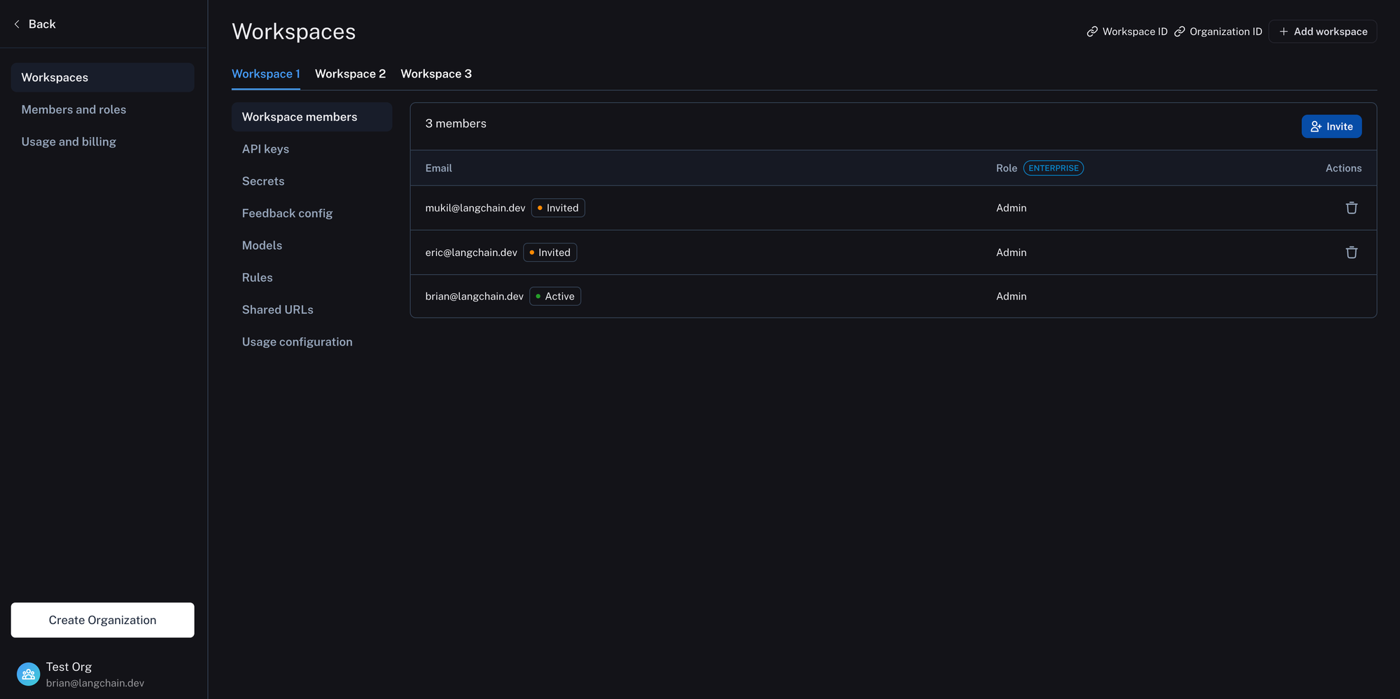 Users in shared organizations for LangSmith can create multiple workspaces and assign teams, business units, deployment environments, or another internal grouping to each one for streamlined efficiency. They’ll also be able to invite multiple users to your organization and workspace(s) at the same time, at the organization level. See our docs for more details.