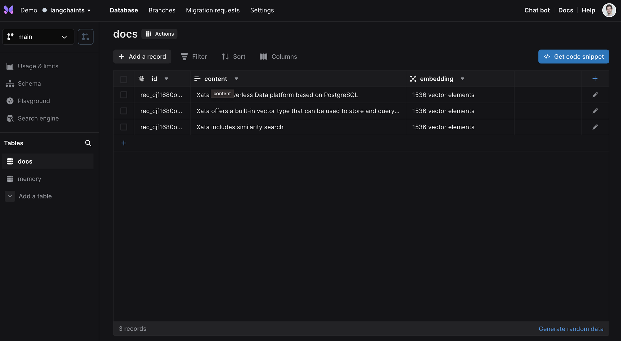 If you look at the data via the Xata UI while the example is running, you will see two tables: docs and memory. The docs table is populated with the documents from the vector store, having a content column and an embedding column of type vector: