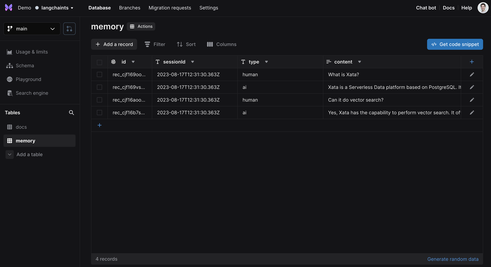 Next, we create a chat memory store, again based on Xata. This stores the messages exchanged by the chat bots with the users in a Xata table. Each conversation gets a session ID, which is then used to retrieve the previous messages in the conversation, so that the context is not lost.