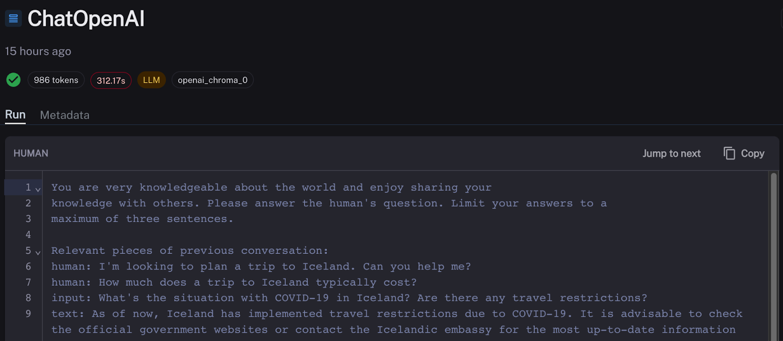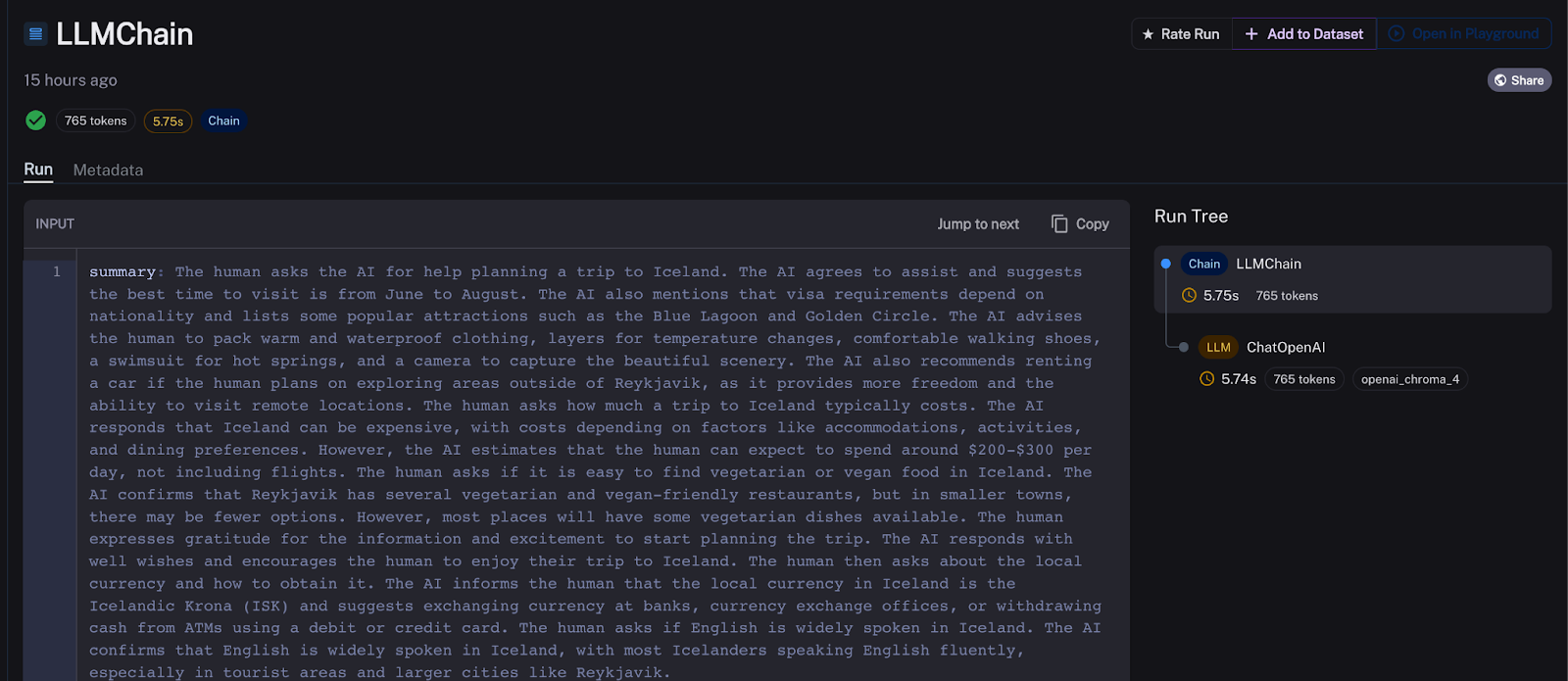 The results in LangSmith are below. The total chain runtime for each experiment run is down to ~16 seconds, almost entirely explained by OpenAI API latency. Zep generates summaries in the background, which are automatically added by the ZepMemory instance to my prompt alongside the most recent chat history.