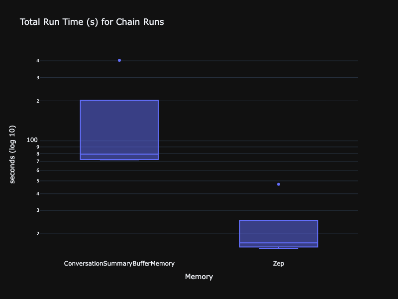 Let’s take a more quantitative look at the data. First comparing the distribution of run times, p95 and p99 for each experiment. There were 5 experiments, and we ran them for both chains using the ConversationSummaryBufferMemory and ZepMemory. The chart below uses a log scale for latency. As we saw above, Zep’s runtimes were an order of magnitude lower.