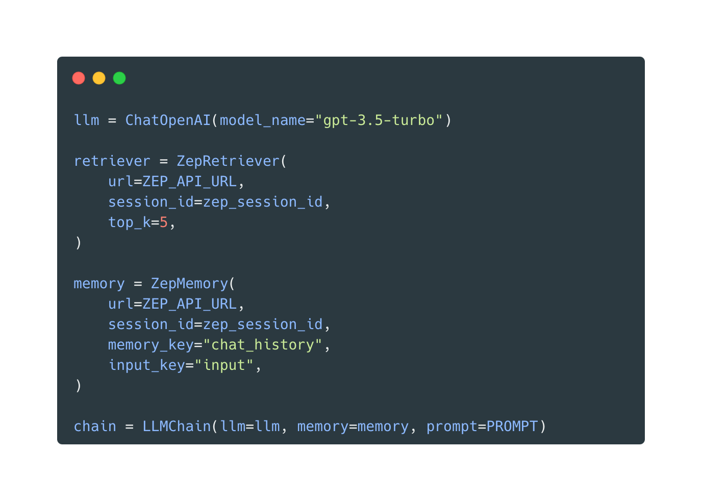Zep’s ZepMemory and ZepRetriever classes are shipped in the LangChain codebase for Python and JS and are drop-in replacements for LangChain’s native classes. Rerunning the experiment with Zep is super simple. I installed the Zep server using Zep’s docker-compose setup and modified my code.