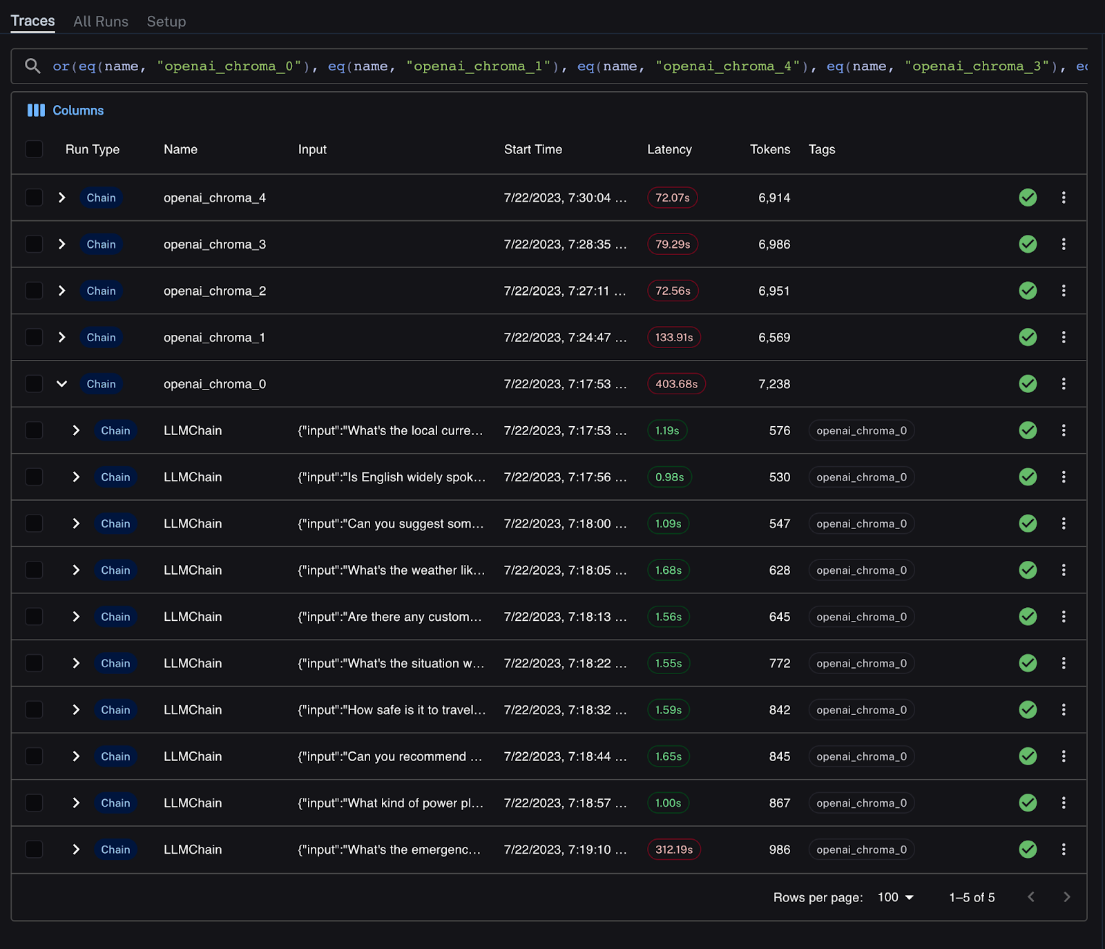 Drilling into that chain, I see a poor response time from the OpenAI API, taking over 5 minutes to respond to the request. It’s possible that the initial request failed and there were retries. Unfortunately, the OpenAI API can sometimes see rate-limiting and high variance in latency.